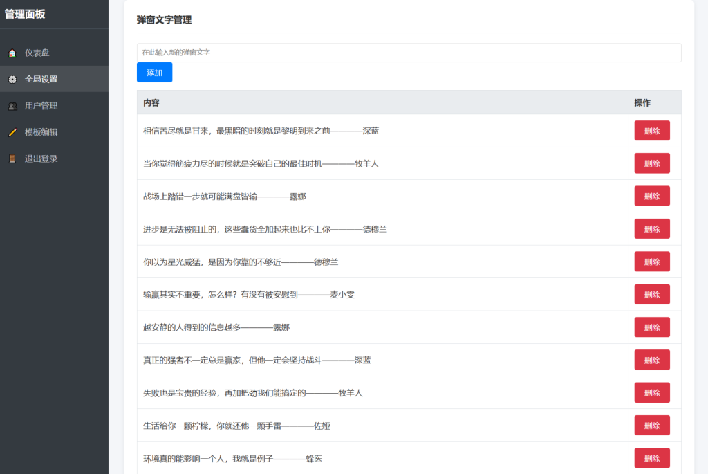 1、全功能后台:你可以在后台修改自己的登录密码,管理所有弹窗文字(增删改查),自定义全局的背景音乐、背景颜色、弹窗颜色,甚至还能塞点JS特效代码进去。
